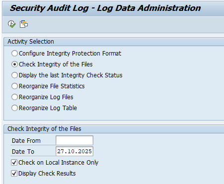 To validate if the audit log files integrity is ok (no tampering has been done), start transaction RSAU_ADMIN and select the option: Check Integrity of the Files: