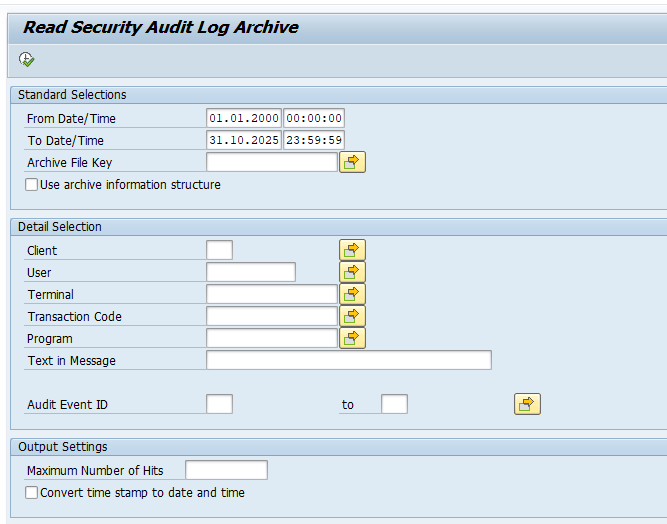 After pressing execute, you will get a popup screen to select the archive files. Output is a simple ALV list with the audit log event details.