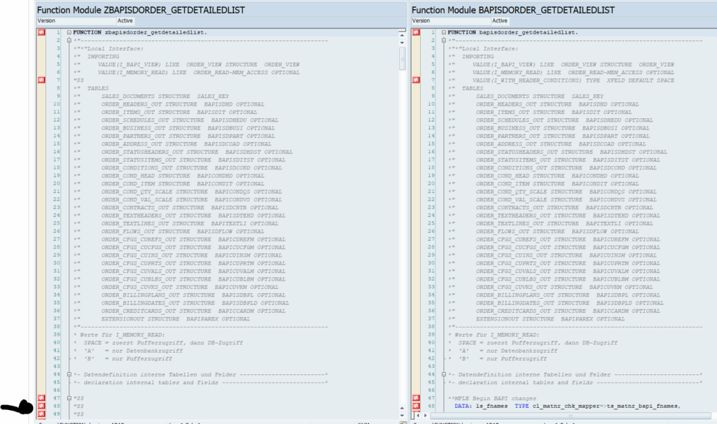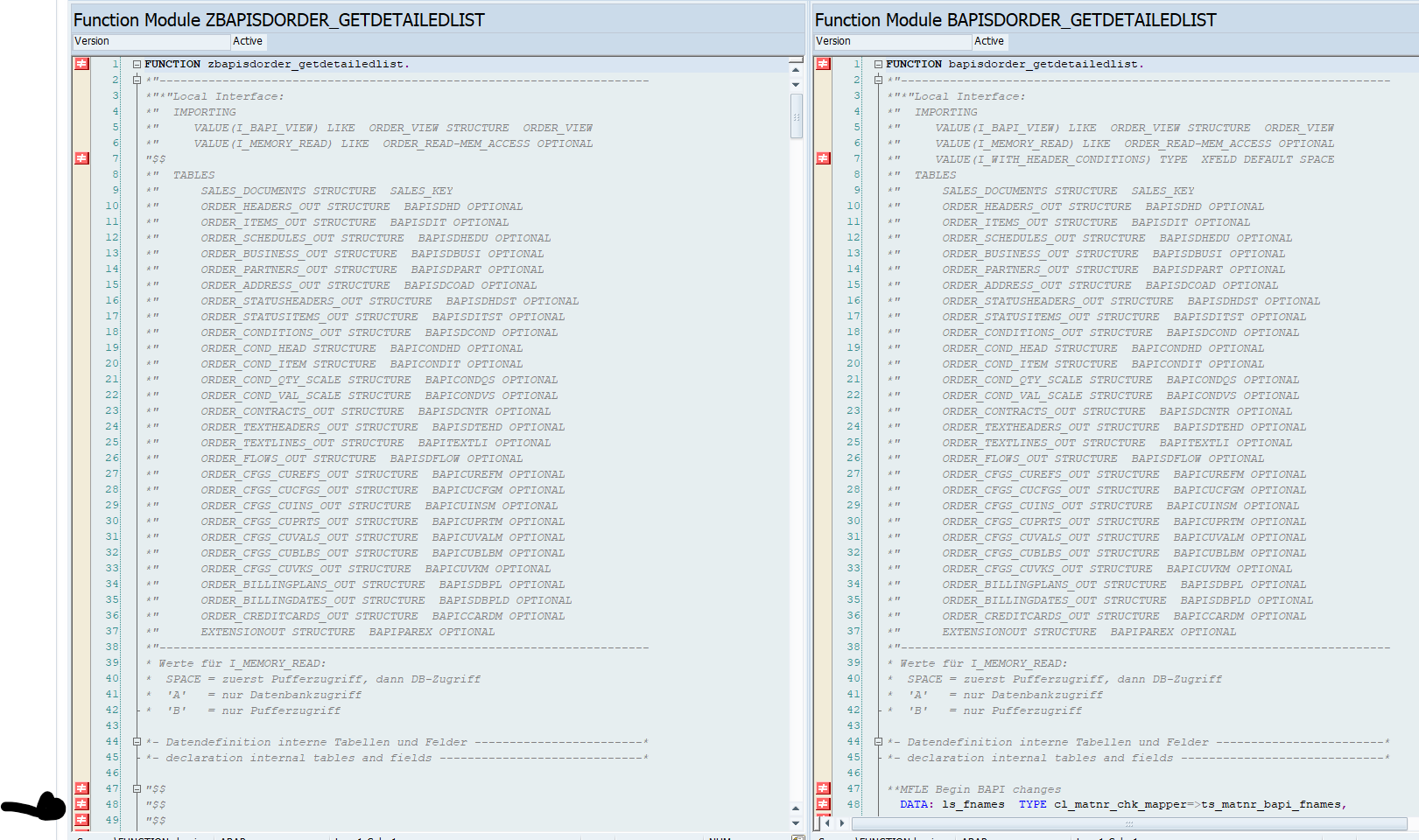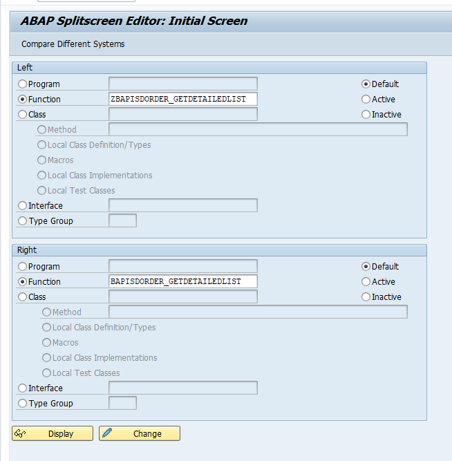 The SE39 transaction is used to compare two ABAP’s in split screen mode. This can be two ABAP programs in single system, or by clicking on the button Compare Different Systems between two systems. With the cross system comparison the tool will ask for which RFC to use.