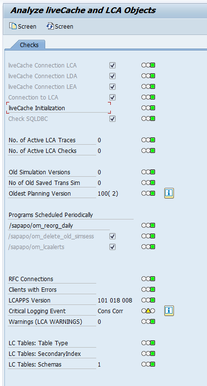 Transaction LCA03 can be used for generic health checks. Launch this transaction, wait, and ignore the error message at the bottom if needed by clicking the back button, to reach this screen:
