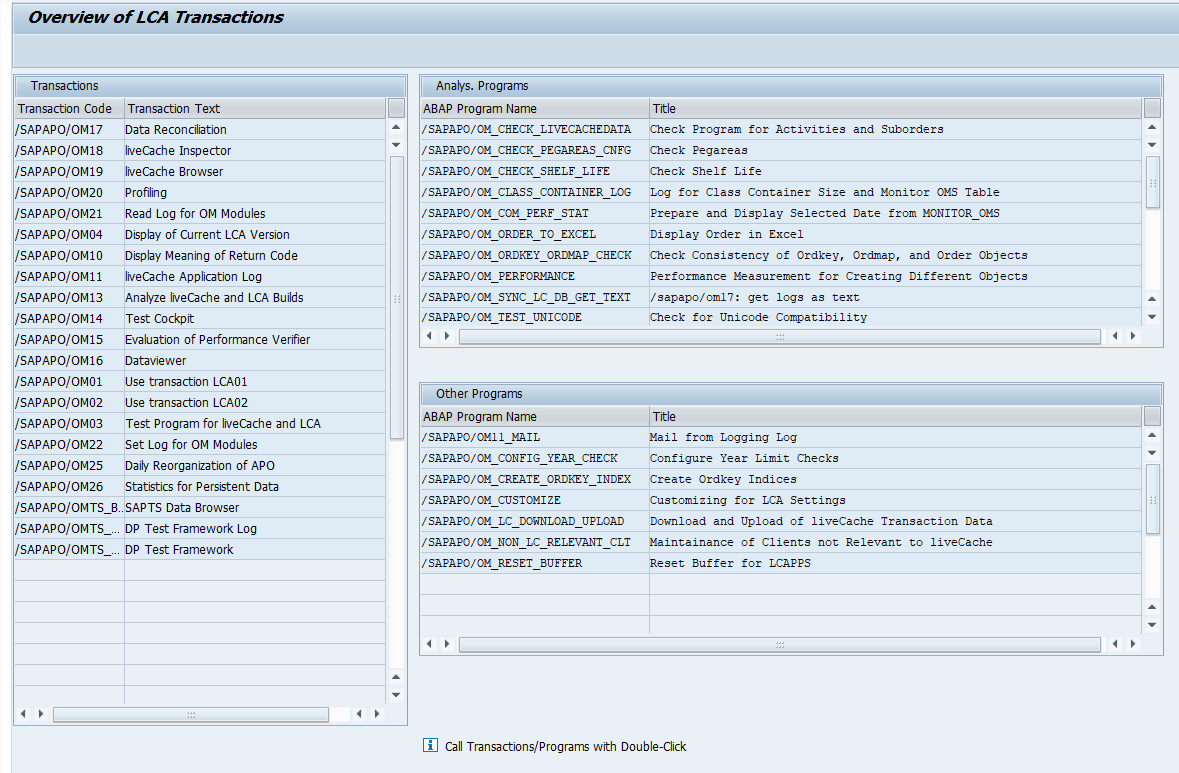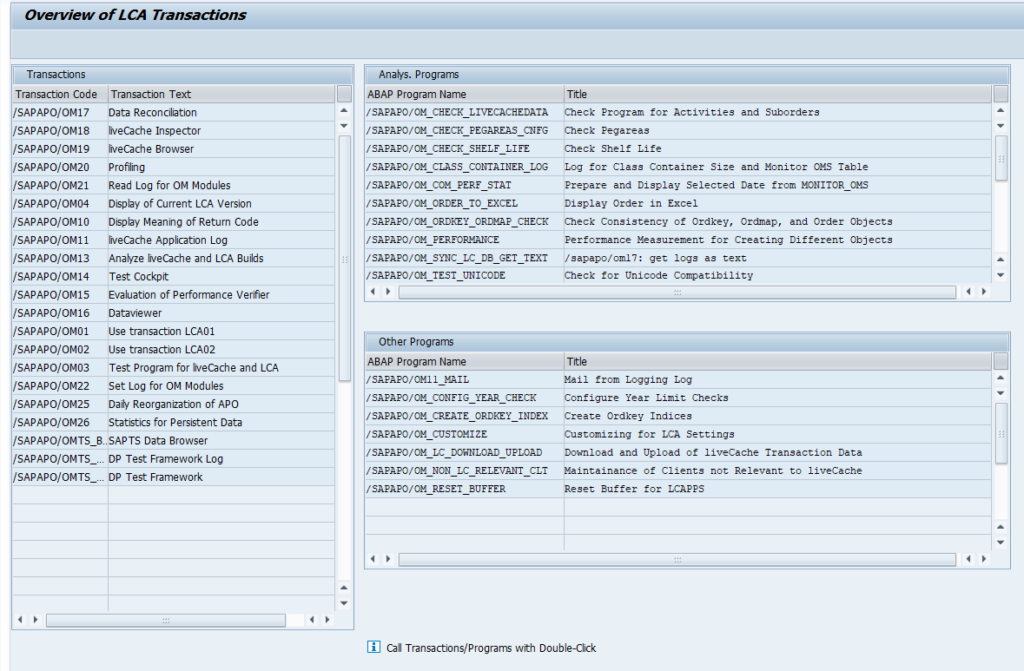 Start transaction /SAPAPO/OM00 to get an overview of all LiveCache LCA transactions: